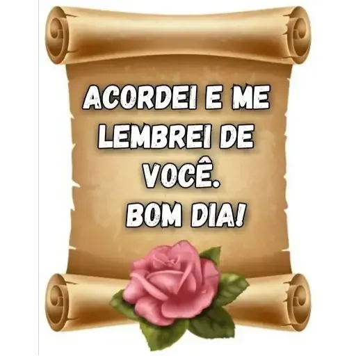 Un pergamino con una rosa rosa y la frase 'ACORDEI E ME LEMBREI DE VOCÊ. BOM DIA!'