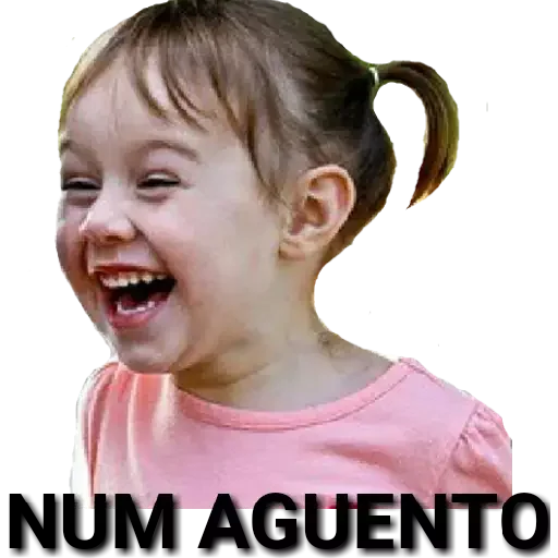 Niña con flequillo y cola de caballo, vestida con una blusa rosa, con expresión de alegría y el texto 'NUM AGUENTO' debajo.