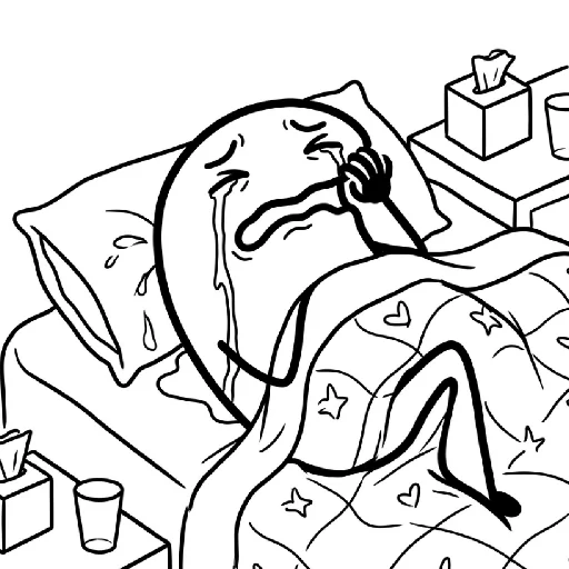 Um desenho simples de um personagem com expressão de tristeza ou preocupação, com lágrimas azuis nos olhos e a mão no…