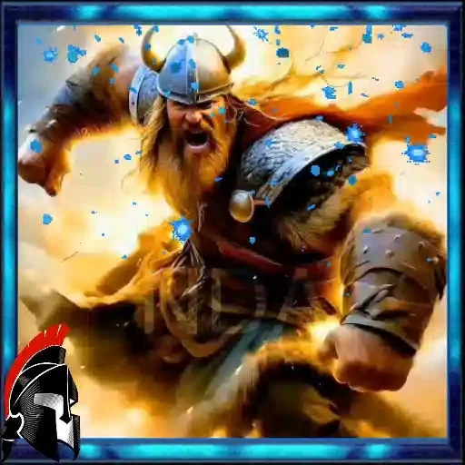 Un guerrero vikingo con armadura y casco con cuernos, brazos musculosos y barba larga, en medio de una explosión de llamas y agua.