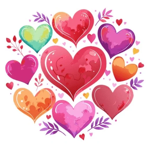Un conjunto de corazones coloridos de diferentes tamaños, incluyendo tonos de rosa, rojo, naranja, morado y verde, rodeados de hojas y pequeños corazones.