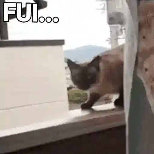 Gato siamés marrón oscuro con ojos azules mirando hacia abajo, con la palabra 'FUI...' destacada en la esquina superior izquierda. El gato está en una ventana con un paisaje al fondo.