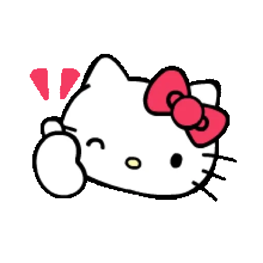 Cara de Hello Kitty con un lazo rosa, haciendo un gesto con la mano y dos triángulos rosas detrás de la cabeza.