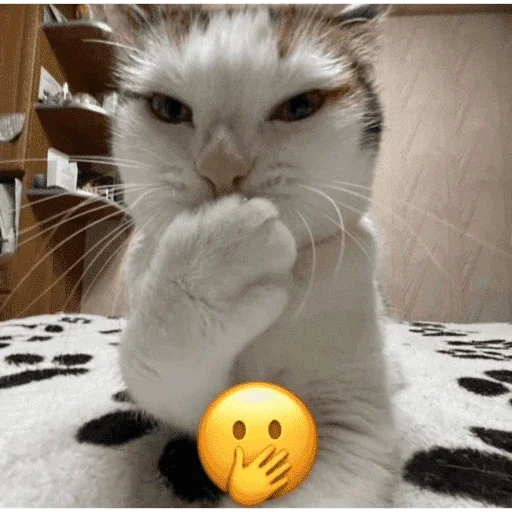 Gato branco com expressão facial séria e olhos apertados, parecendo insatisfeito ou desapontado. Fundo desfocado com…