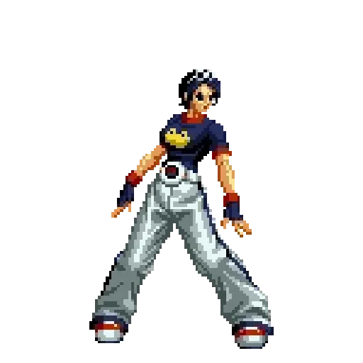 Personaje de anime con cabello negro y camisa azul con un diseño amarillo en el pecho, pantalones plateados y pulseras azules y naranjas.