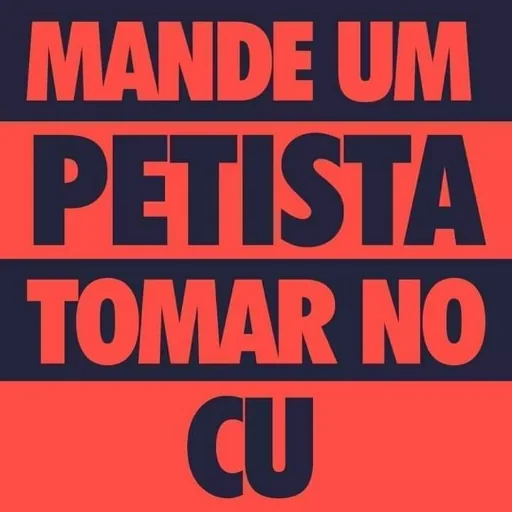Una figurita con texto en rojo y negro. Las palabras 'MANDE UM PETISTA TOMAR NO CU' se muestran en letras grandes sobre un fondo naranja y negro.