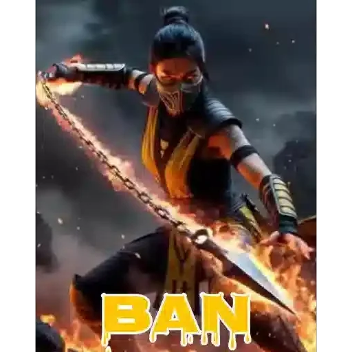 Un personaje de Mortal Kombat con máscara, cabello negro recogido y armadura, empuñando una espada en llamas con la palabra 'BAN' destacada.