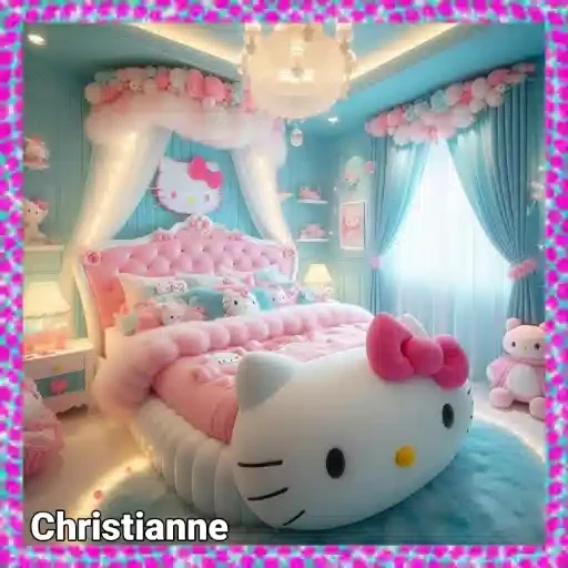 Habitación infantil decorada con tema de Hello Kitty, con cama rosa y azul, cortinas y pared azul, y una almohada grande en forma de cabeza de Hello Kitty con un lazo rosa. El nombre 'Christianne' aparece en la parte inferior izquierda.