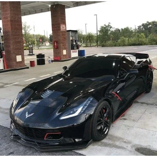 Un coche deportivo negro en una estación de gasolina. El coche tiene un diseño aerodinámico y está posicionado frente a una bomba de gasolina.