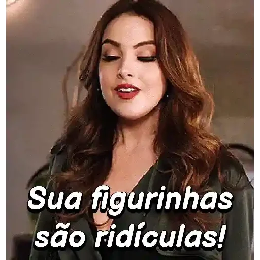 Una mujer con cabello castaño y ojos cerrados, vestida con un blazer negro, con el texto "Sua figurinhas são ridículas!" superpuesto.