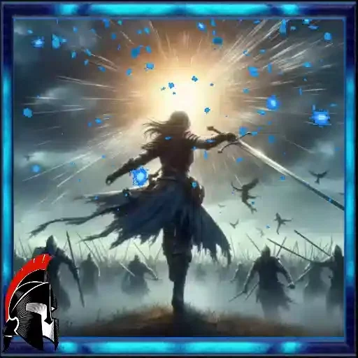 Un guerrero con una espada está de pie en una colina, con el sol brillante al fondo y pájaros volando alrededor. Tiene el cabello largo y una capa que vuela al viento.