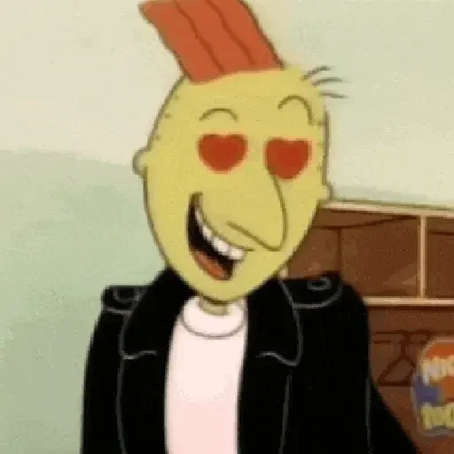 Personagem de desenho animado com cabelo laranja e expressão facial séria, vestindo uma jaqueta vermelha e óculos.