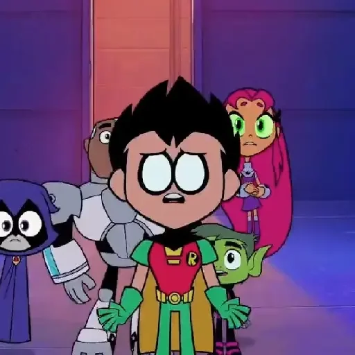 Personajes de 'Teen Titans Go!' con expresiones sorprendidas, incluyendo Robin, Cyborg, Estrella, Raven y Chico Bestia.