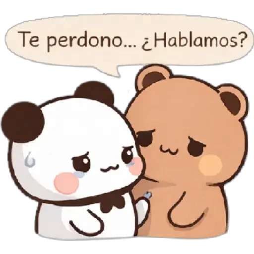 Dos osos lindos, uno blanco y uno marrón, con expresiones tristes. El oso blanco tiene una lágrima en el ojo y el oso marrón parece enojado. La burbuja de diálogo dice 'Te perdono... ¿Hablamos?'