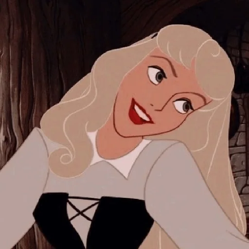 Princesa Aurora, de A Bela Adormecida, com expressão curiosa e vestida com um traje rosa e preto.