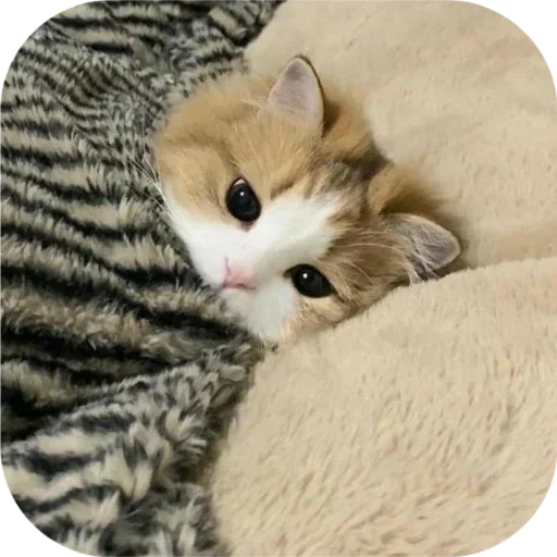 Gatito lindo con ojos grandes y pelaje naranja y blanco, parcialmente cubierto por mantas de cebra y beige.