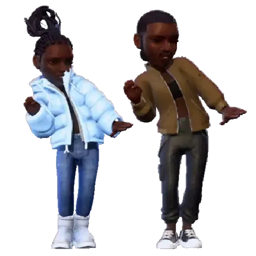Dos personajes de Sims bailando, un niño y una niña, con ropa casual y sonriendo.