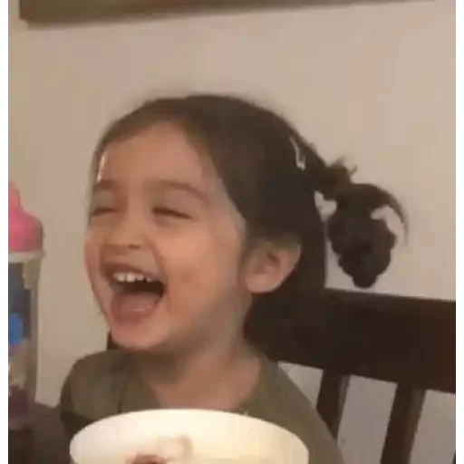 Menina com cabelo castanho e camisa rosa, fazendo careta com os olhos fechados e boca aberta, mostrando os dentes.