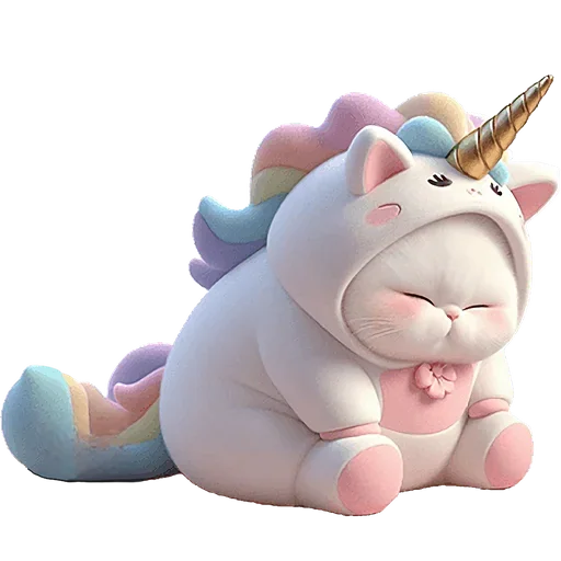 Gatito vestido de unicornio con cuerno dorado, orejas rosadas y cola pastel. El gato tiene una expresión adorable y los ojos cerrados.