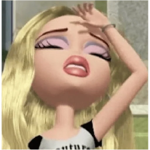 Rosto de boneca Barbie com expressão surpresa ou preocupada, mão no rosto e faixa rosa na cabeça.