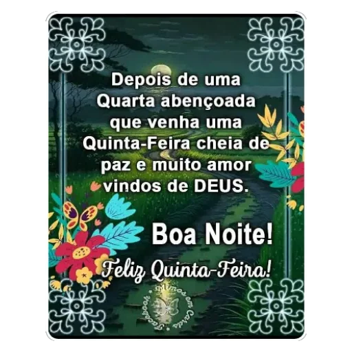 Un mensaje de buenas noches con flores coloridas y texto en portugués. El mensaje dice 'Depois de uma Quarta abençoada que venha uma Quinta-Feira cheia de paz e muito amor vindos de DEUS. Boa Noite! Feliz Quinta-Feira!'.