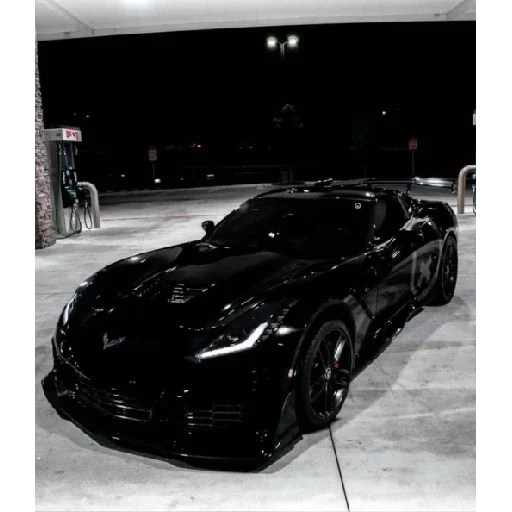 Un coche deportivo negro en una estación de gasolina por la noche.