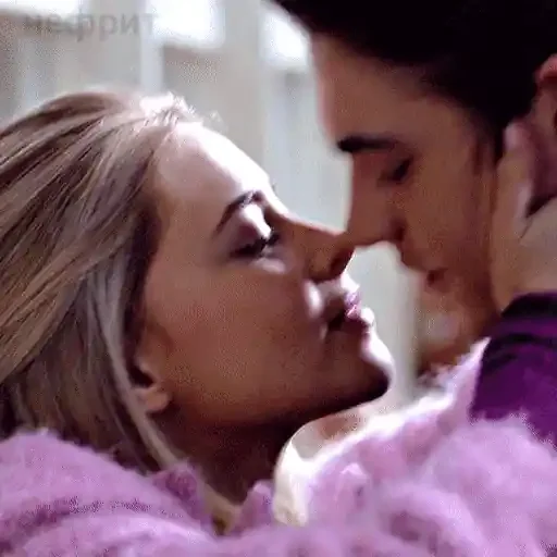 Una pareja a punto de besarse, la mujer con cabello rubio y el hombre con cabello negro, ambos con expresiones románticas.