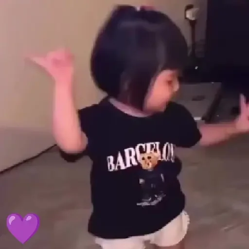 Niña con cabello negro corto bailando, con una camiseta negra que dice 'BARCELONA' y un corazón morado en la esquina.