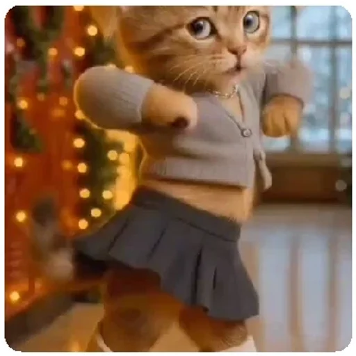 Gato vestido de niña, parece bailar, con árbol de Navidad decorado con luces al fondo. El gato tiene un suéter gris y falda negra.
