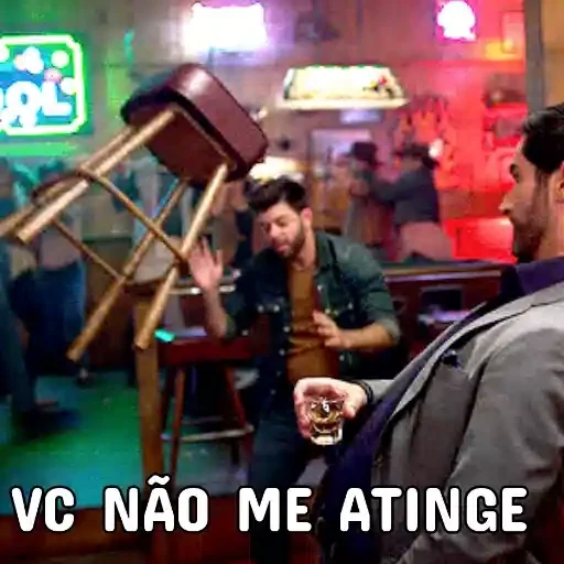 Dos hombres en un bar, uno con una silla rota al fondo y el otro al lado, con el texto 'VC NÃO ME ATINGE' en la parte inferior.