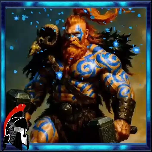 Un guerrero vikingo con cabello rojizo y barba, con armadura y un martillo, con tatuajes azules en el cuerpo y la cara.