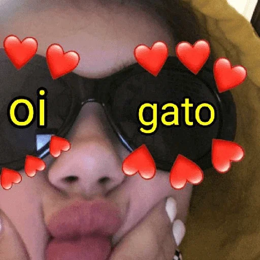 Rostro de una mujer con gafas de sol, lengua fuera y texto 'oi gato' en amarillo, rodeado de corazones rojos.