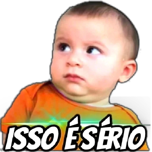 Un bebé con expresión seria y mirada lateral, vistiendo una camiseta naranja. Debajo de él, dice 'ISSO É SÉRIO'.