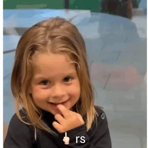 Niña rubia con expresión pensativa, mano en el mentón y cabello castaño claro, vistiendo una camisa negra con 'rs' en el pecho.