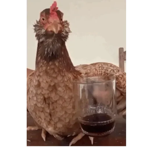 Una gallina marrón con un peine rojo mira hacia adelante, con un vaso de vino tinto al lado.