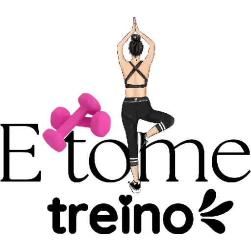 Una mujer con leggings negros haciendo yoga en una pierna con los brazos levantados, junto a mancuernas rosadas y el texto 'E tome treino'.