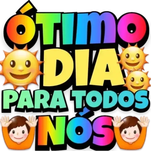 Un sticker colorido con la frase 'Ótimo dia para todos nós' en letras grandes y coloridas, acompañado de un sol sonriente, dos emojis sonrientes y dos niños con los brazos levantados.