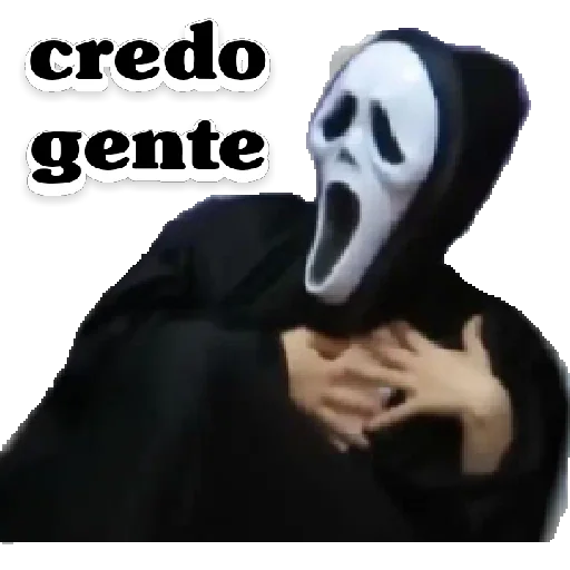 Um homem usando uma máscara branca de Halloween com olhos pretos, parecendo assustador, em um ambiente escuro.