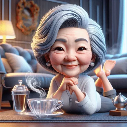 Una mujer anciana con cabello gris y una sonrisa amistosa, acostada en una mesa con una taza de té delante de ella.