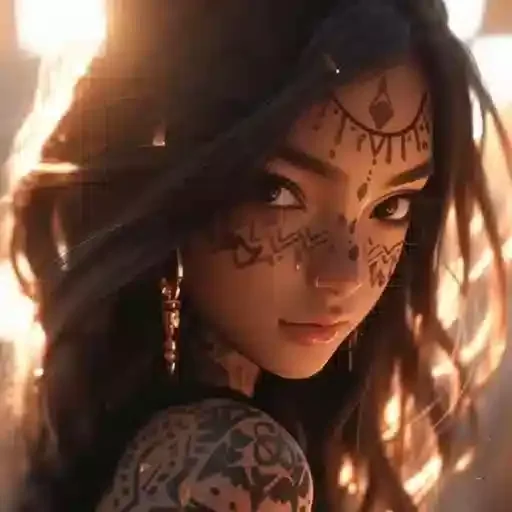 Una mujer con tatuajes en la cara y el brazo, cabello largo y oscuro, mirando hacia adelante con una expresión seria. Tiene un diseño tribal en la cara y un brillo en el fondo.