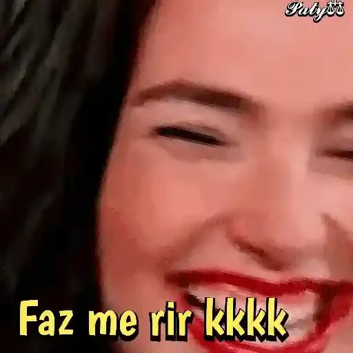 Rostro de mujer con ojos semicerrados y sonrisa, lápiz de labios rojo, texto amarillo 'Faz me rir kkkk'.