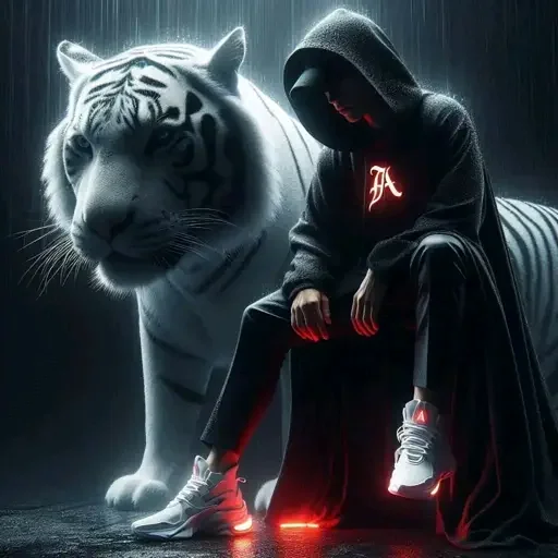 Un hombre con capucha y una chaqueta negra con una letra roja en el pecho está sentado junto a un tigre blanco en un ambiente oscuro y sombrío. Usa zapatillas blancas y tiene las manos cerca del suelo.