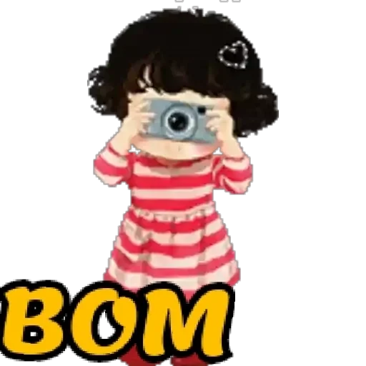 Una niña con un vestido de rayas rojas y blancas toma una foto con una cámara gris, con la palabra 'BOM' en amarillo debajo.