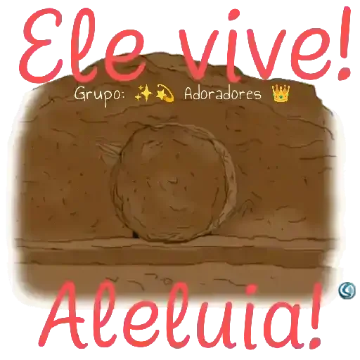 Tumba vacía con 'Ele vive!' y 'Aleluia!' escritos en letras rojas. Fondo blanco.