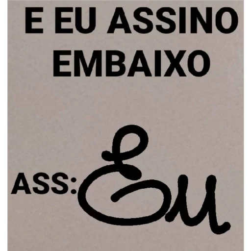 Un fondo gris con el texto 'E EU ASSINO EMBAIXO' en negro y una firma estilizada 'ASS: Eu' debajo.