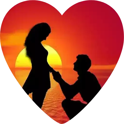 Una pareja en silueta al atardecer, el hombre de rodillas y la mujer de pie, tomados de las manos, dentro de un corazón rojo.