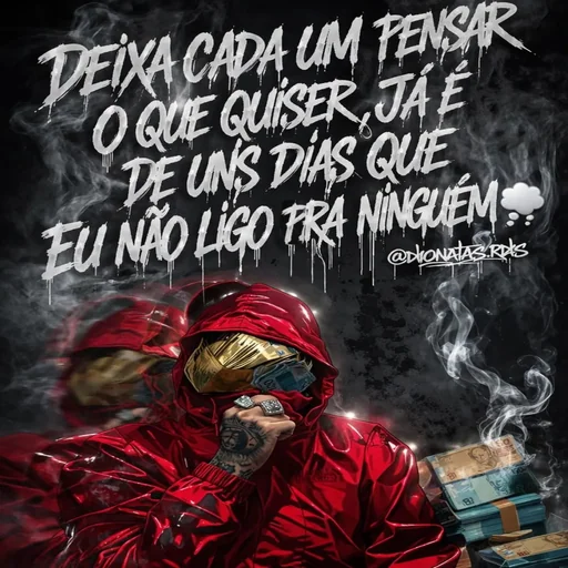 Un hombre enmascarado y encapuchado, con un cigarrillo, en un ambiente oscuro con humo. La frase 'Deixa cada um pensar o que quiser, já é de uns dias que eu não ligo pra ninguém' está escrita encima de él.