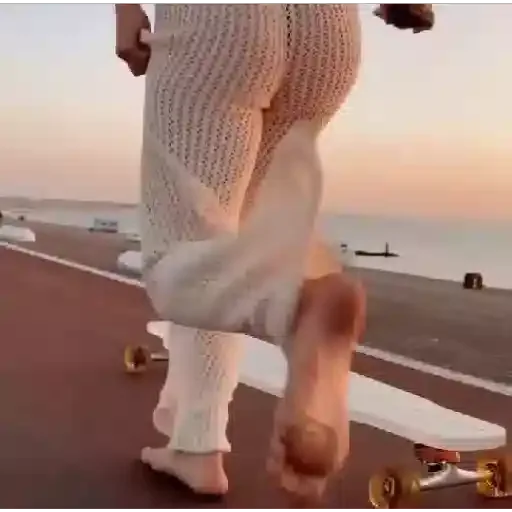 Persona corriendo con un skate, descalza, en un muelle al atardecer. La persona viste ropa clara y el fondo muestra el mar con tonos naranja y rosa.