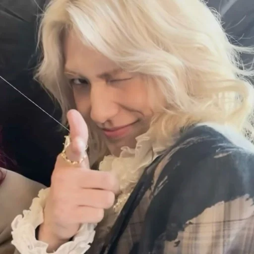 Menina com cabelo loiro encaracolado fazendo careta e gesto de paz com a mão, com emojis de mão fazendo V e rosto com…
