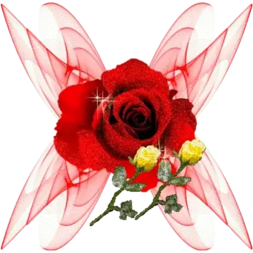 Una rosa roja con alas de mariposa rosa y dos pequeñas flores amarillas.